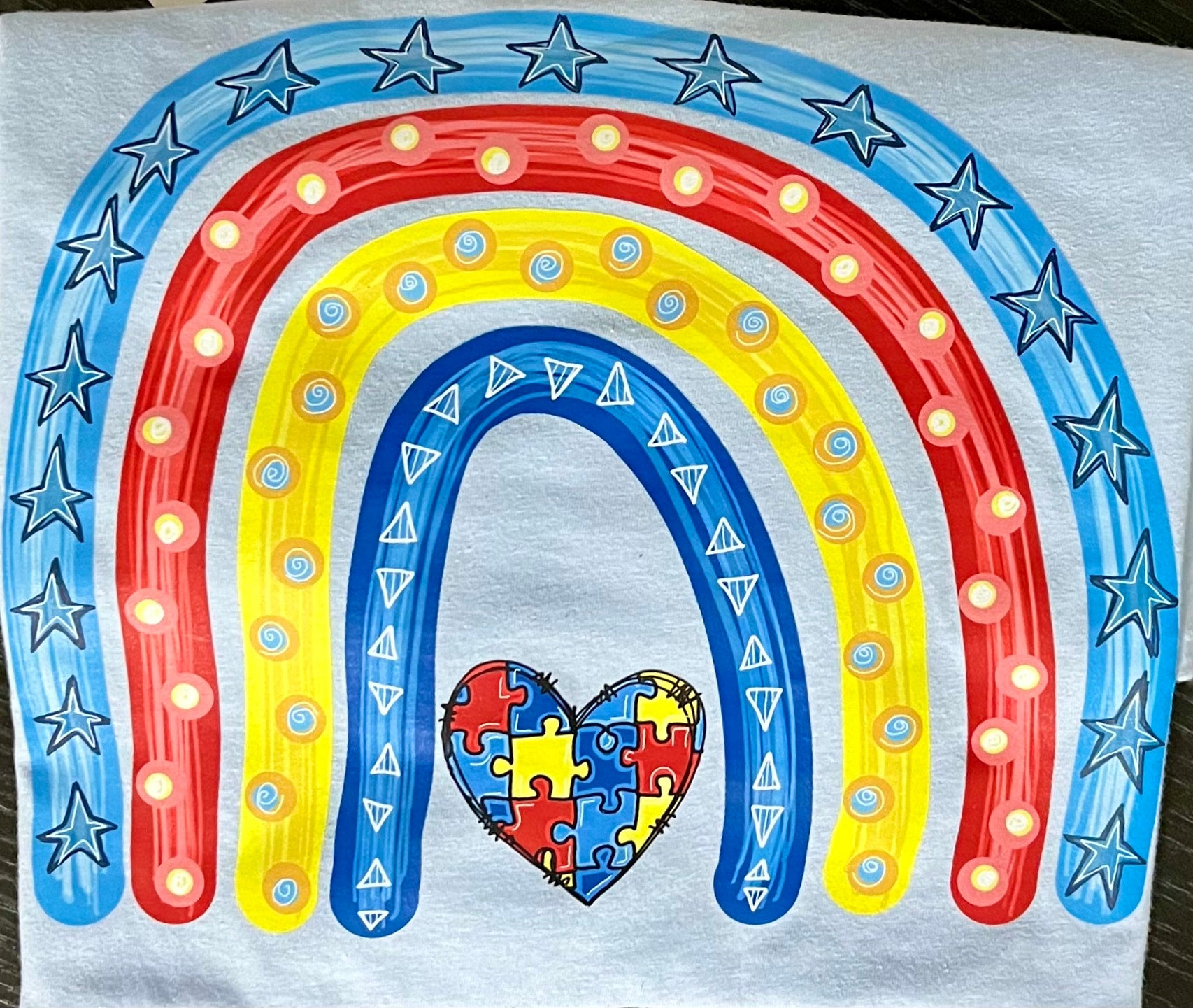 Spread awareness with this Autism Rainbow T-shirt. Sporting a vibrant rainbow design, this shirt is a fun way to show your support and spread awareness.